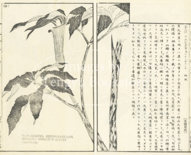 江戸時代後期の本草学者 飯沼慾斎(1783~1865)による植物図鑑「草木図説」中の1図。およそ1000点に上る植物を取り上げ、正確な図とともに解説した本書は、リンネの分類法を取り入れた日本で最初の近代的植物図鑑。本図は明治時代に刊行された増訂版のもの。