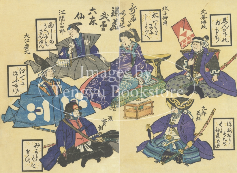 幕末期の二枚続の風刺浮世絵「かるたあわせ 鎌蔵武勇六家仙」 。