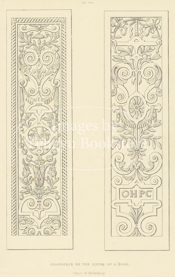19世紀イギリスの装飾図案家ヘンリー・ショウ(1800-1873)によるヨーロッパの古典的装飾図案集「オーナメント百科」(後版)中の1ページ。