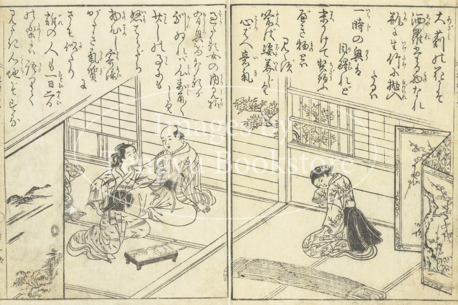 江戸前期から中期にかけて活躍した京都の絵師 西川祐信(にしかわ すけのぶ:1671-1750)による絵本の挿絵。