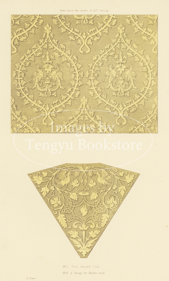 19世紀イギリスの装飾図案家ヘンリー・ショウ(1800-1873)によるヨーロッパの古典的装飾図案集「オーナメント百科」(後版)中の1ページ。