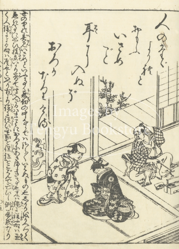 江戸前期から中期にかけて活躍した京都の絵師 西川祐信(にしかわ すけのぶ:1671-1750)による絵本の挿絵。北条時頼(最明寺殿)による教訓歌に絵をつけています。
