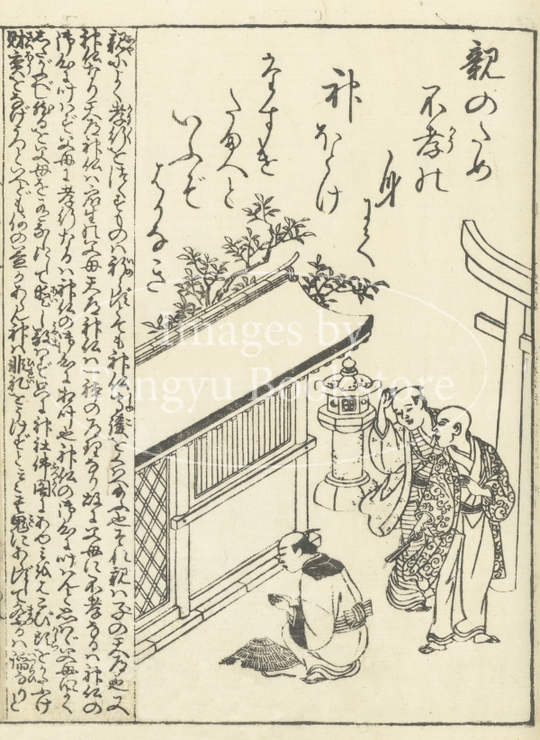 江戸前期から中期にかけて活躍した京都の絵師 西川祐信(にしかわ すけのぶ:1671-1750)による絵本の挿絵。北条時頼(最明寺殿)による教訓歌に絵をつけています。
