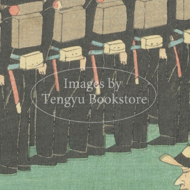 江戸時代後期から明治時代にかけての浮世絵師 歌川広重二代目(1826-1869)による三枚続の浮世絵。