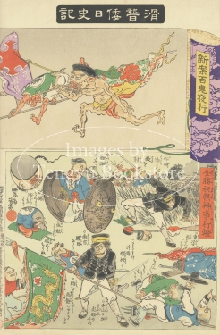 上側に妖怪たちの百鬼夜行、下側に日清戦争をモチーフにした絵巻という構成になっています。