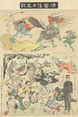 上側に妖怪たちの百鬼夜行、下側に日清戦争をモチーフにした絵巻という構成になっています。