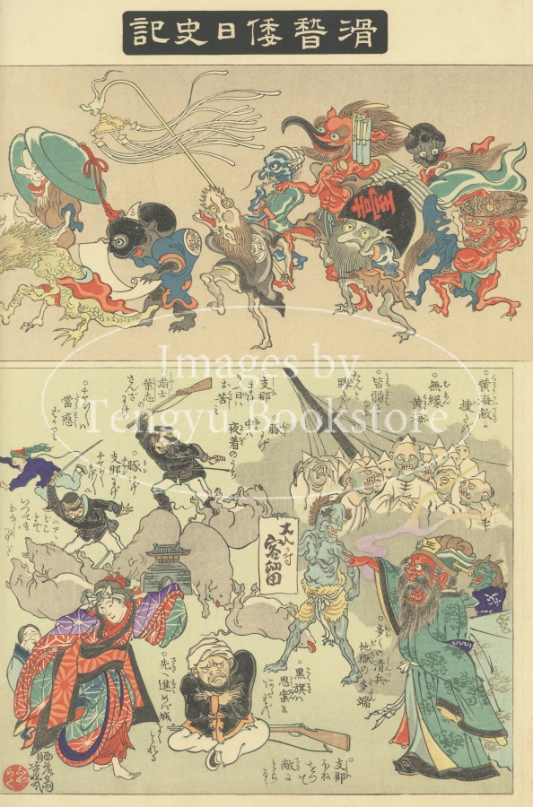 上側に妖怪たちの百鬼夜行、下側に日清戦争をモチーフにした絵巻という構成になっています。