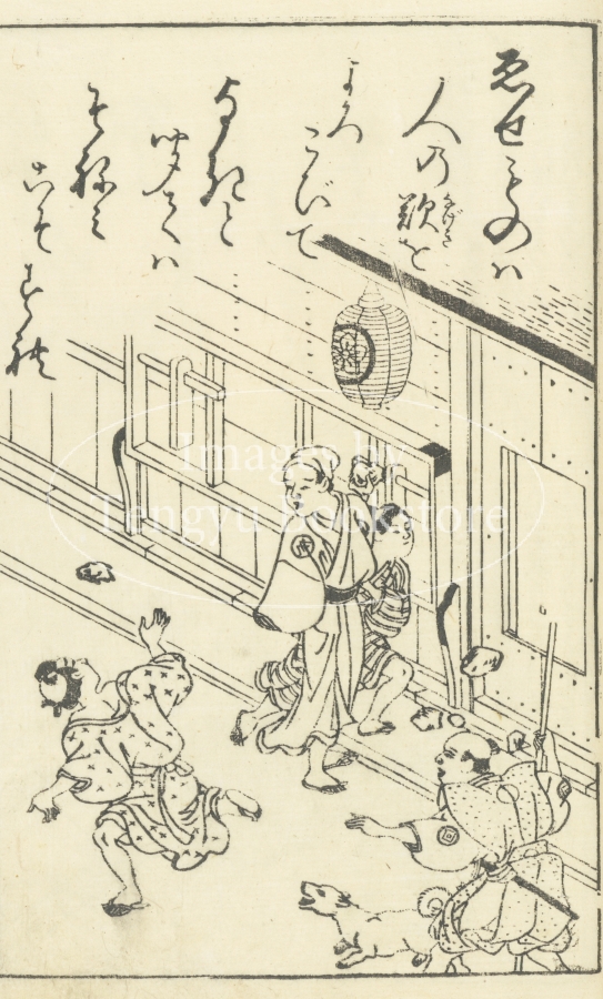 江戸前期から中期にかけて活躍した京都の絵師 西川祐信(にしかわ すけのぶ:1671-1750)による絵本の挿絵。北条時頼(最明寺殿)による教訓歌に絵をつけています。
