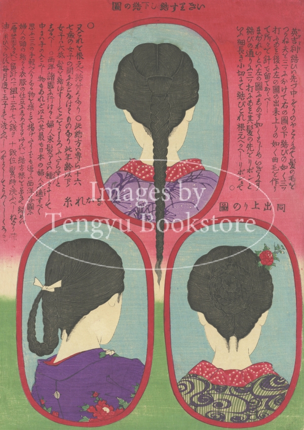 幕末から明治にかけて活躍した浮世絵師 豊原国周(1835-1900)による、明治時代に流行した西洋風の束髪を紹介した2枚続浮世絵のうちの1枚。