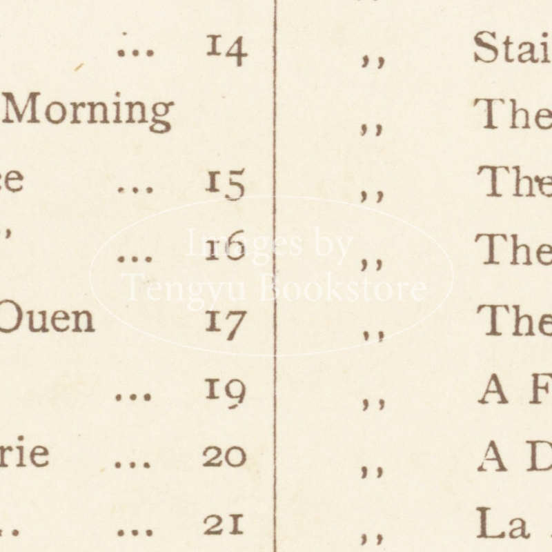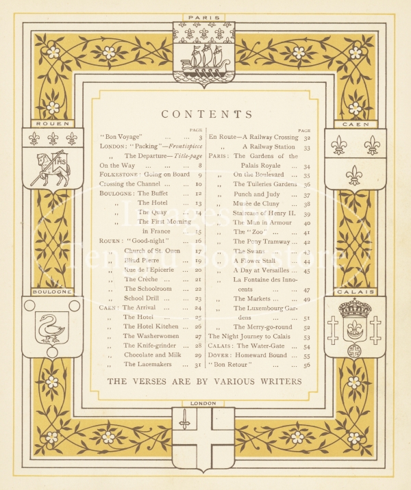 19世紀末イギリスを代表する絵本画家ウォルター・クレイン(1845-1915)の兄で、書籍デザイナーでもあったトーマス・クレイン(1843–1903)の絵本「外国にて」の目次。