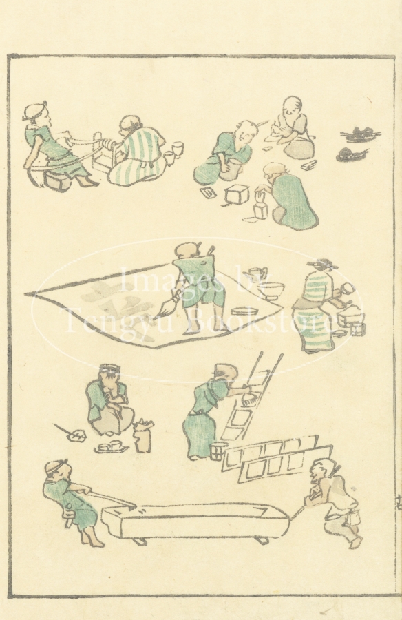 様々な状況の人物をデフォルメした略画を全ページに配した愛らしい画集であるとともに、江戸時代人の仕草の記録でもある興味深い一冊。