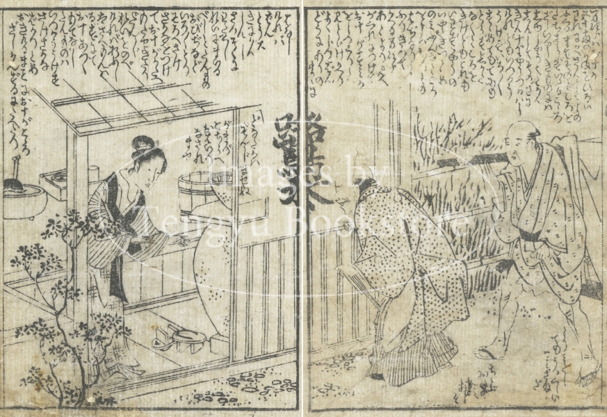 江戸後期の戯作者・絵師の十返舎一九(1765-1831)による黄表紙「質流思外幸」(しちのながれ もっけのさいわい)の1ページ。