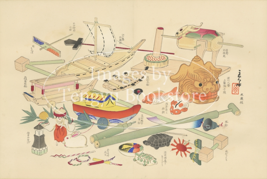 No 323 / 書名:おもちゃ十二月 / Omocha Ju-ni-gatsu / 作者:川崎巨泉 / Kawasaki Kyosen / 刊行国:Japan / 刊行年:1926 明治末から大正、昭和にかけて大阪で活躍した画家 川崎巨泉(1877-1942)が、日本各地の郷土玩具を収集・研究した自身のコレクションから八月の行事にまつわるおもちゃを描いた木版画。