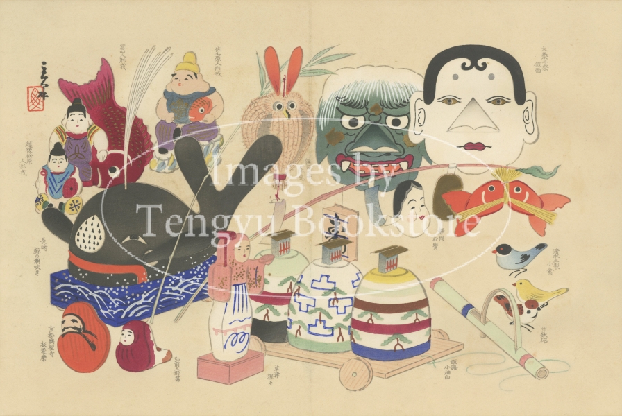 No 325 / 書名:おもちゃ十二月 / Omocha Ju-ni-gatsu / 作者:川崎巨泉 / Kawasaki Kyosen / 刊行国:Japan / 刊行年:1926 明治末から大正、昭和にかけて大阪で活躍した画家 川崎巨泉(1877-1942)が、日本各地の郷土玩具を収集・研究した自身のコレクションから十月の行事にまつわるおもちゃを描いた木版画。
