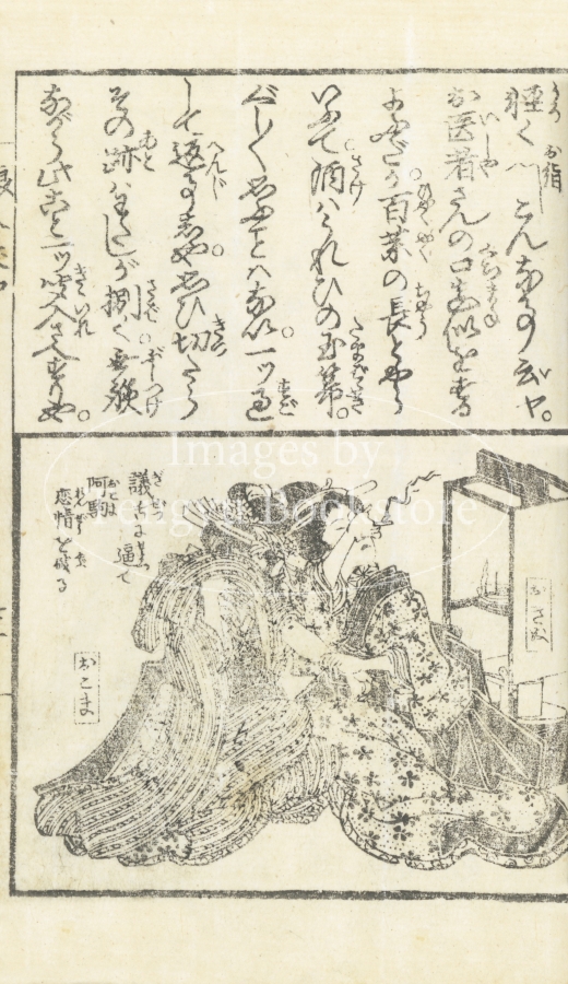 江戸後期に刊行された人情本「錦の帯屋 雪の白木屋 軒並娘八丈」からの一枚。