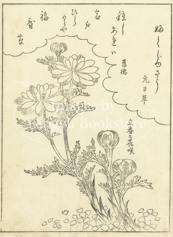 江戸中期に刊行された植物の絵手本「絵本福寿草」からの一枚。