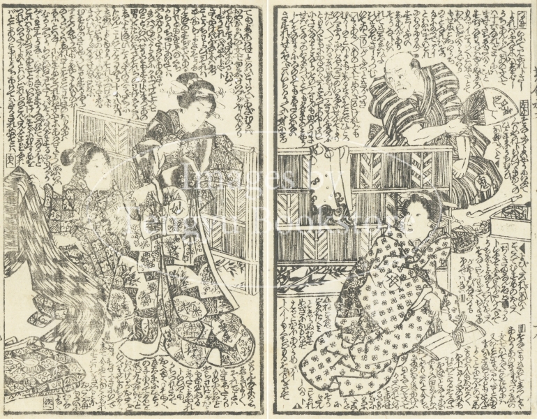 江戸時代後期に刊行された草双紙「黄金水大盡盃」(おうごんすいだいじんさかずき)の挿絵。