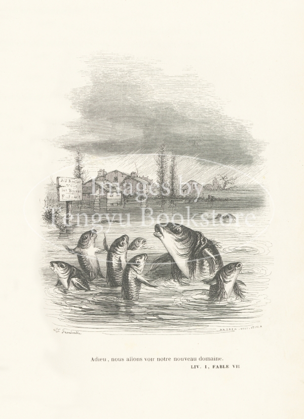 19世紀フランスの挿絵画家J.J.グランヴィル(1803-1847)の挿絵本「フロリアンの寓話」の1ページ。