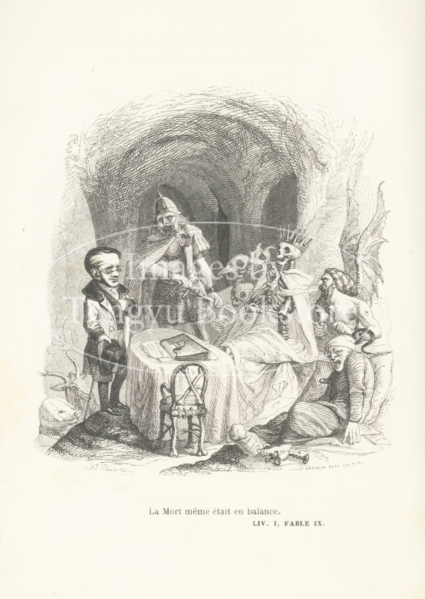 19世紀フランスの挿絵画家J.J.グランヴィル(1803-1847)の挿絵本「フロリアンの寓話」の1ページ。