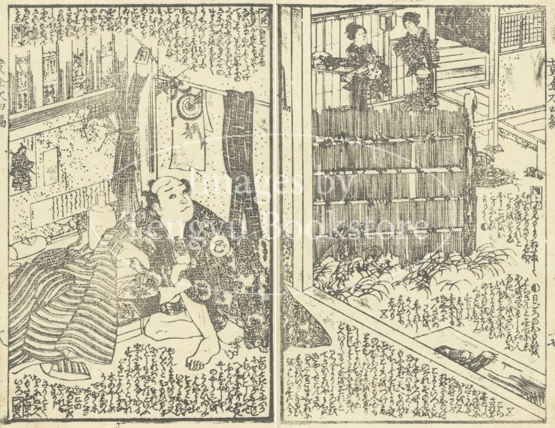 江戸後期の戯作者 為永春水(1790-1844)の物語に、浮世絵師 歌川国輝(生没年不詳)・国光(生没年不詳)・国貞(1786-1865)・国芳(1798-1861)・芳幾(1833-1904)らが挿絵をつけています。