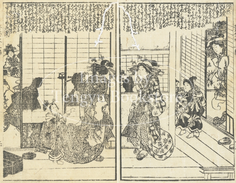 江戸時代後期に刊行された草双紙「黄金水大盡盃」(おうごんすいだいじんさかずき)の挿絵。