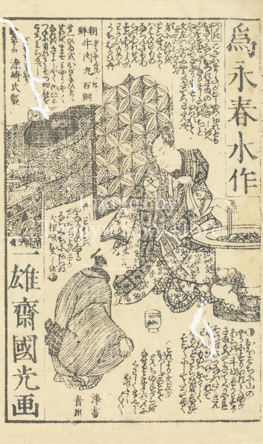 江戸後期の戯作者 為永春水(1790-1844)の物語に、浮世絵師 歌川国輝(生没年不詳)・国光(生没年不詳)・国貞(1786-1865)・国芳(1798-1861)・芳幾(1833-1904)らが挿絵をつけています。