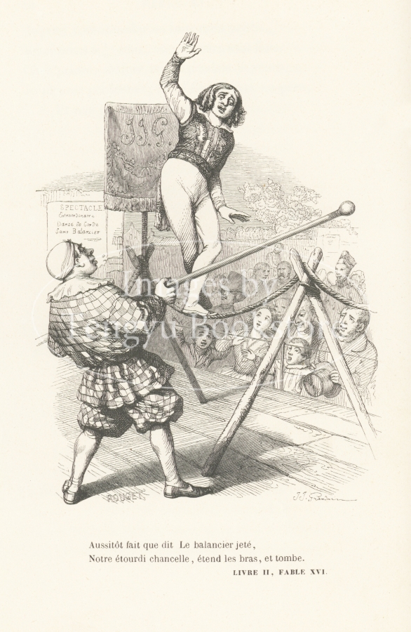 19世紀フランスの挿絵画家J.J.グランヴィル(1803-1847)の挿絵本「フロリアンの寓話」の1ページ。