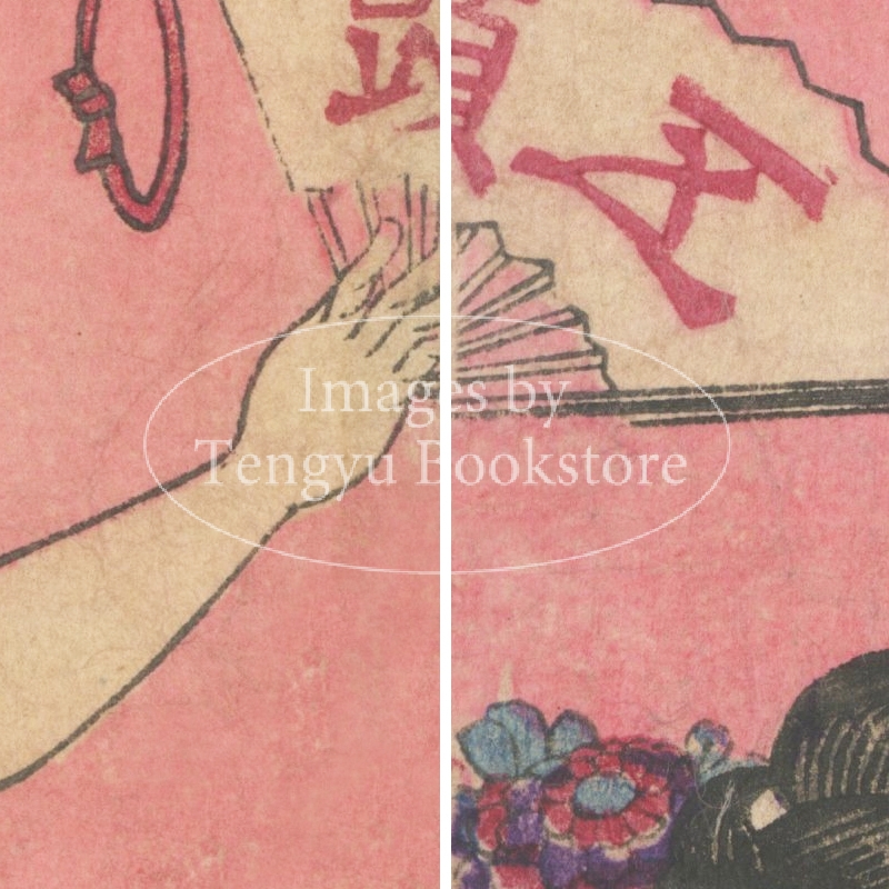 幕末・明治期の浮世絵師 歌川国利(1847-1899)による二枚続の浮世絵。本図は妊娠の仕組みを解説したもの。