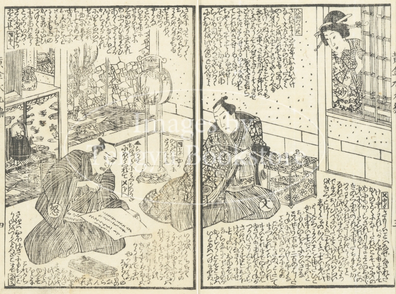 江戸時代後期に刊行された草双紙「黄金水大盡盃」(おうごんすいだいじんさかずき)の挿絵。