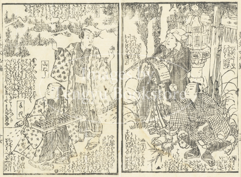 江戸後期の戯作者 為永春水(1790-1844)の物語に、浮世絵師 歌川国輝(生没年不詳)・国光(生没年不詳)・国貞(1786-1865)・国芳(1798-1861)・芳幾(1833-1904)らが挿絵をつけています。