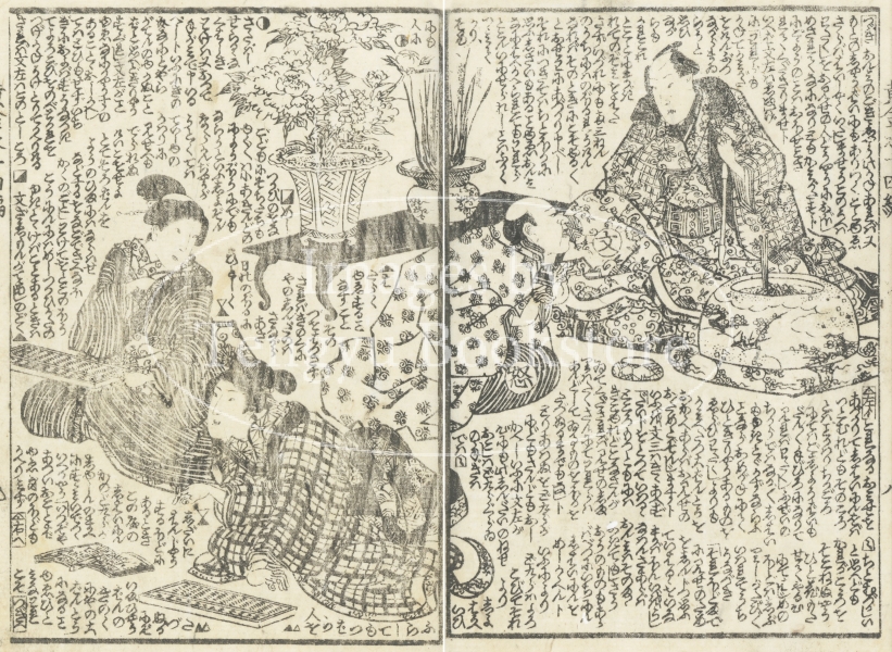 江戸時代後期に刊行された草双紙「黄金水大盡盃」(おうごんすいだいじんさかずき)の挿絵。