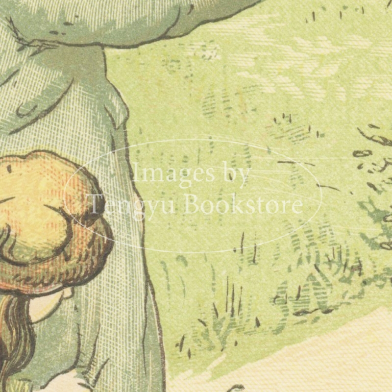 多色刷木版による色鮮やかで愛らしい絵本作品として好評を博しましたが、同時期に活躍していた絵本画家ケイト・グリーナウェイの作風と酷似していたため一部で物議を呼んだ問題作でもありました。
