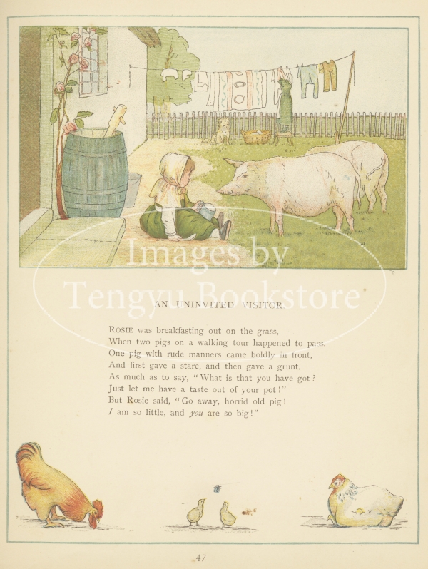 多色刷木版による色鮮やかで愛らしい絵本作品として好評を博しましたが、同時期に活躍していた絵本画家ケイト・グリーナウェイの作風と酷似していたため一部で物議を呼んだ問題作でもありました。