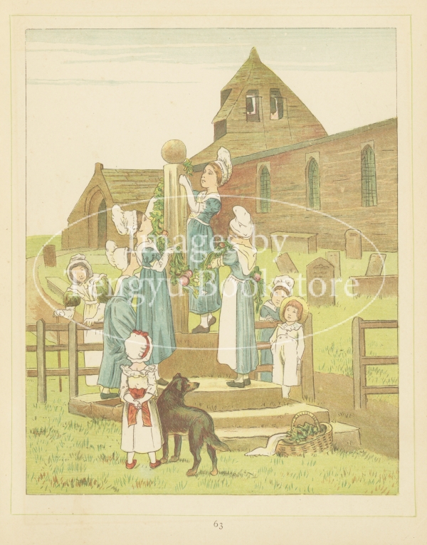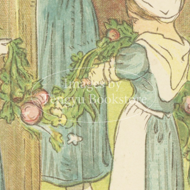 多色刷木版による色鮮やかで愛らしい絵本作品として好評を博しましたが、同時期に活躍していた絵本画家ケイト・グリーナウェイの作風と酷似していたため一部で物議を呼んだ問題作でもありました。