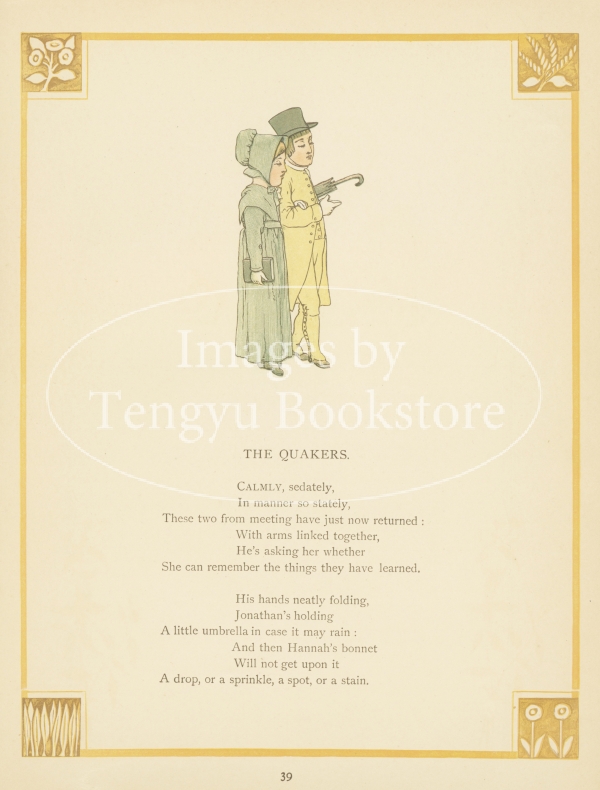 多色刷木版による色鮮やかで愛らしい絵本作品として好評を博しましたが、同時期に活躍していた絵本画家ケイト・グリーナウェイの作風と酷似していたため一部で物議を呼んだ問題作でもありました。