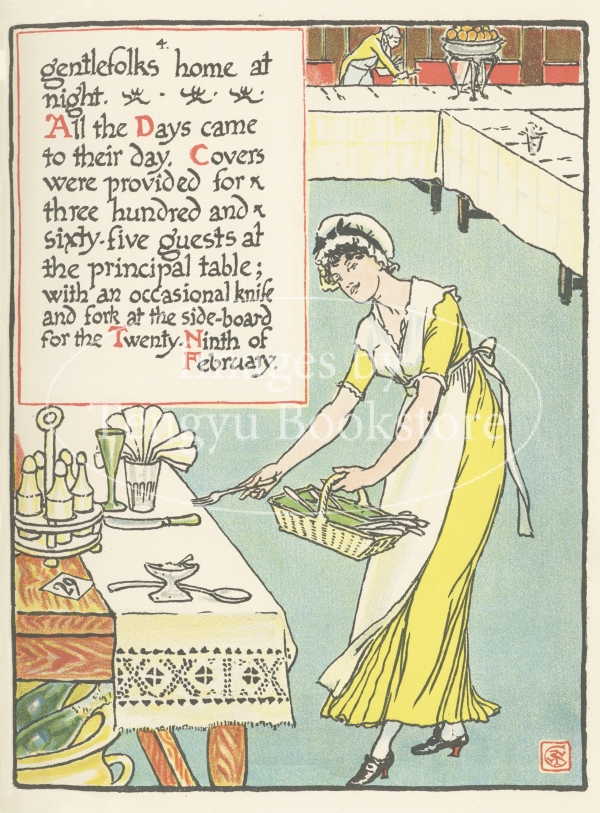 19世紀イギリスの作家チャールズ・ラム(1775-1834)の代表作「エリア随筆」収録の1篇を、19世紀末イギリスの絵本画家ウォルター・クレイン(1845-1915)が絵本にした「新年の仮装祝賀会」の挿絵。