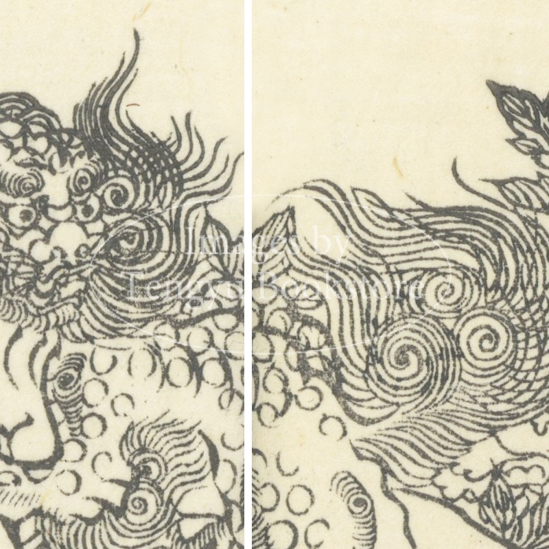 本来は2枚に分けて描かれた作品であるため、色味や図案の整合に若干の不統一があることをご了承ください。