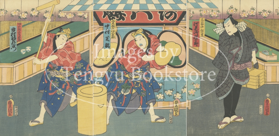 江戸時代後期を代表する浮世絵師のひとり 三代豊国(歌川国貞:1786-1865)による三枚続の役者絵。