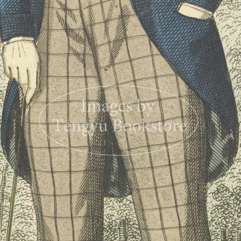 女性ファッションが大半を占めるファッションプレートにおいて、男性のファッションを中心にした本図は当時の紳士服を記録した貴重な服飾資料です。