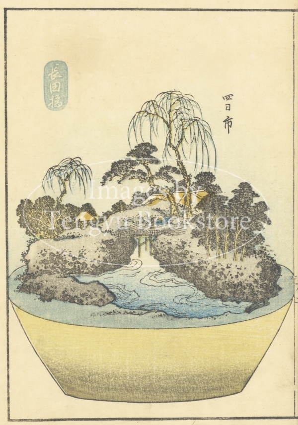 江戸から京都に至る街道「東海道」中の53箇所の宿場を題材にした盆栽図集「東海道五十三駅鉢山図絵(とうかいどうごじゅうさんつぎはちやまずえ)」中の1枚。