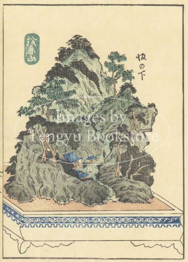 江戸から京都に至る街道「東海道」中の53箇所の宿場を題材にした盆栽図集「東海道五十三駅鉢山図絵(とうかいどうごじゅうさんつぎはちやまずえ)」中の1枚。