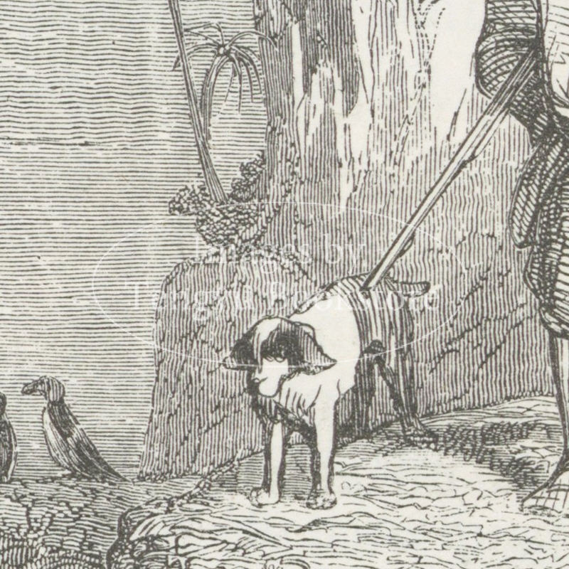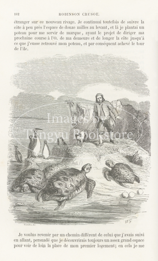 18世紀イギリスの小説「ロビンソン・クルーソー」に、奇想画を得意とする19世紀フランスのイラストレーター、J.J.グランヴィル(1803-1847)が挿絵を手掛けた、19世紀刊行版挿絵本。