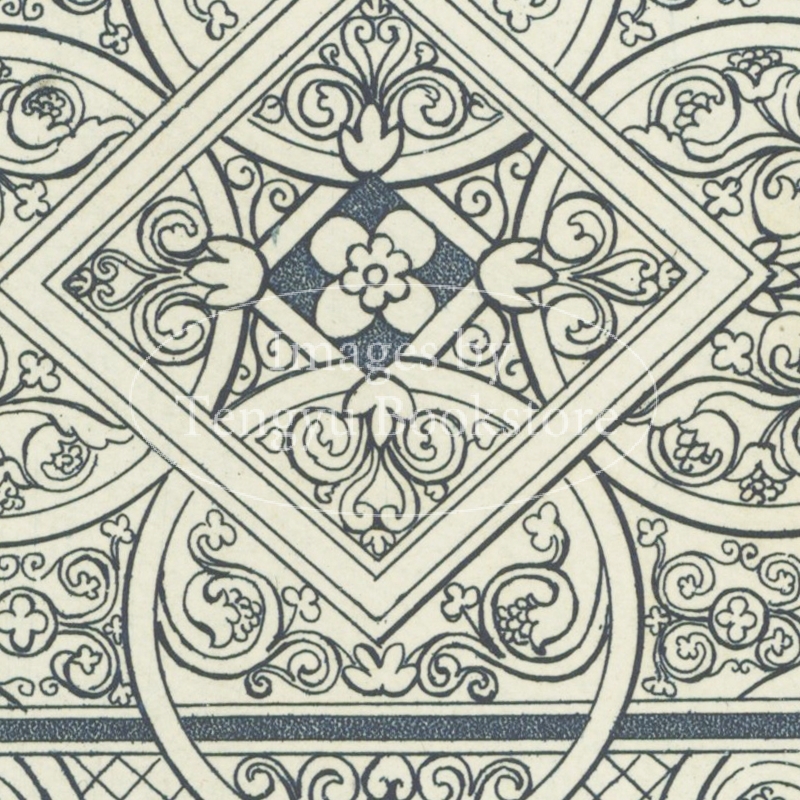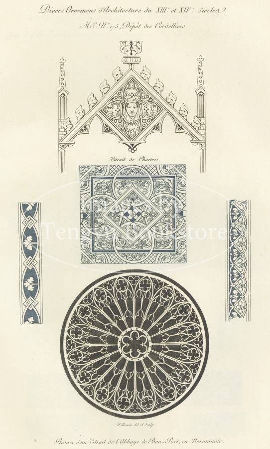 本書は中世フランスの建築や道具などに見られる歴史的装飾デザインを収集し、銅版画に起こした図版集。