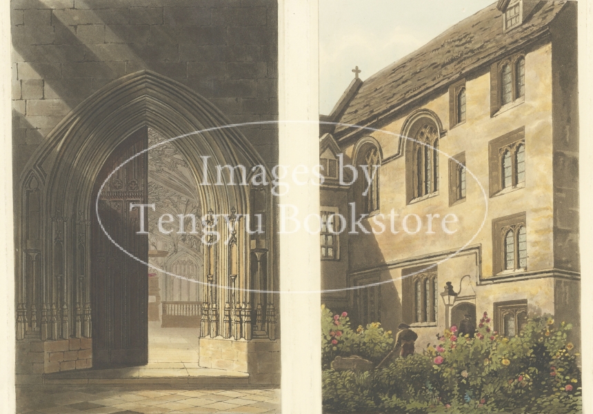 美麗な挿絵本を数多く出版したルドルフ・アッカーマン社が手掛けた本書は、歴史ある大学の建築を様々な角度から描いた手彩色銅版画を約60点枚収録したもの。