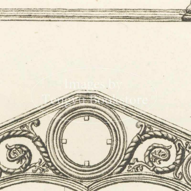 本書は中世フランスの建築や道具などに見られる歴史的装飾デザインを収集し、銅版画に起こした図版集。
