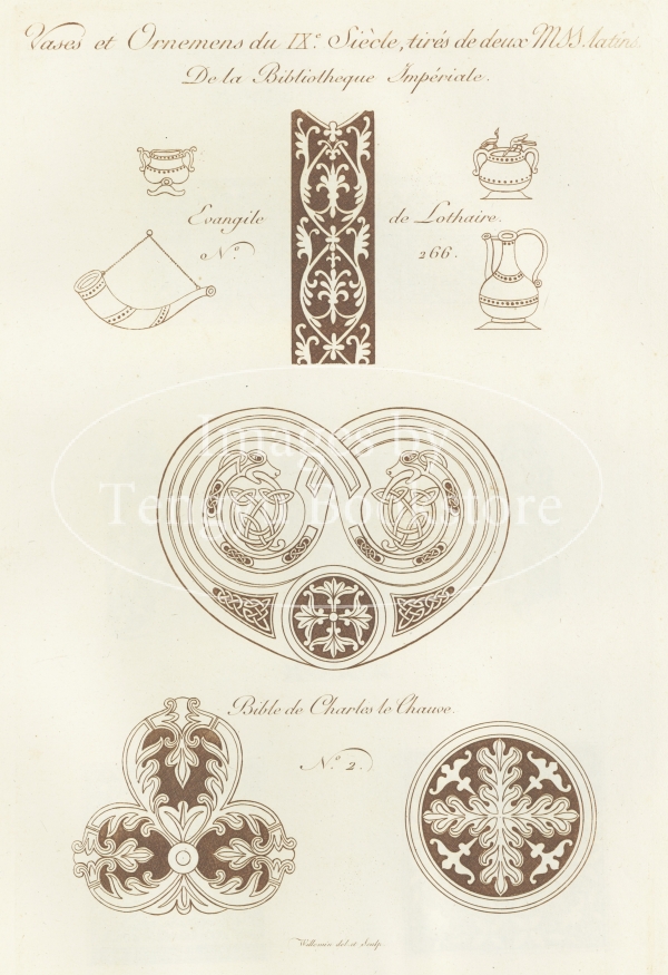 本書は中世フランスの建築や道具などに見られる歴史的装飾デザインを収集し、銅版画に起こした図版集。