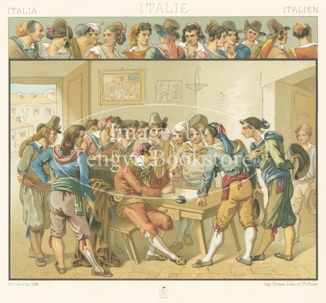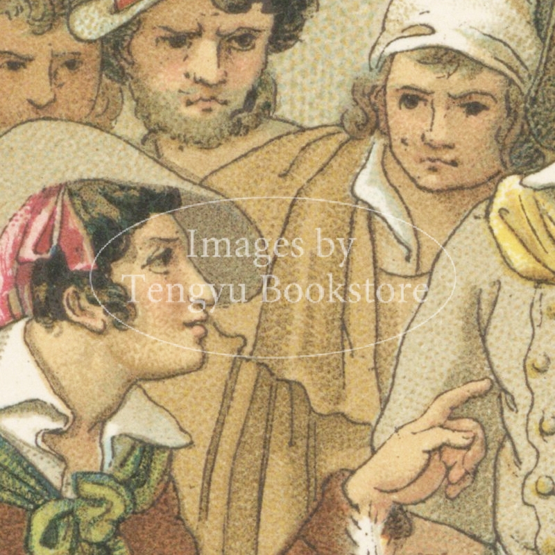 多色刷石版によってカラー印刷された、世界の歴史的衣装や民族衣装の図は、資料的な価値はもちろん、美術的にも評価の高い貴重なイラストです。