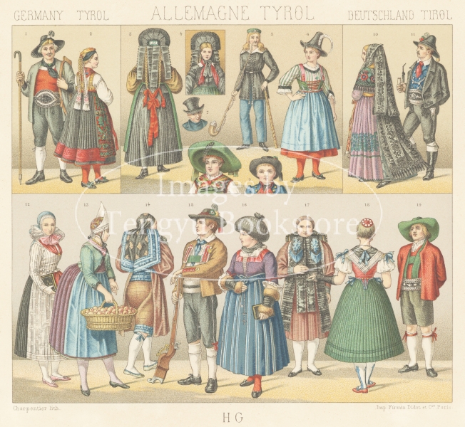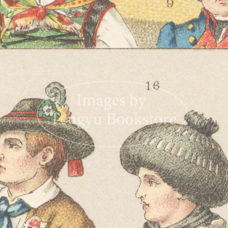 多色刷石版によってカラー印刷された、世界の歴史的衣装や民族衣装の図は、資料的な価値はもちろん、美術的にも評価の高い貴重なイラストです。