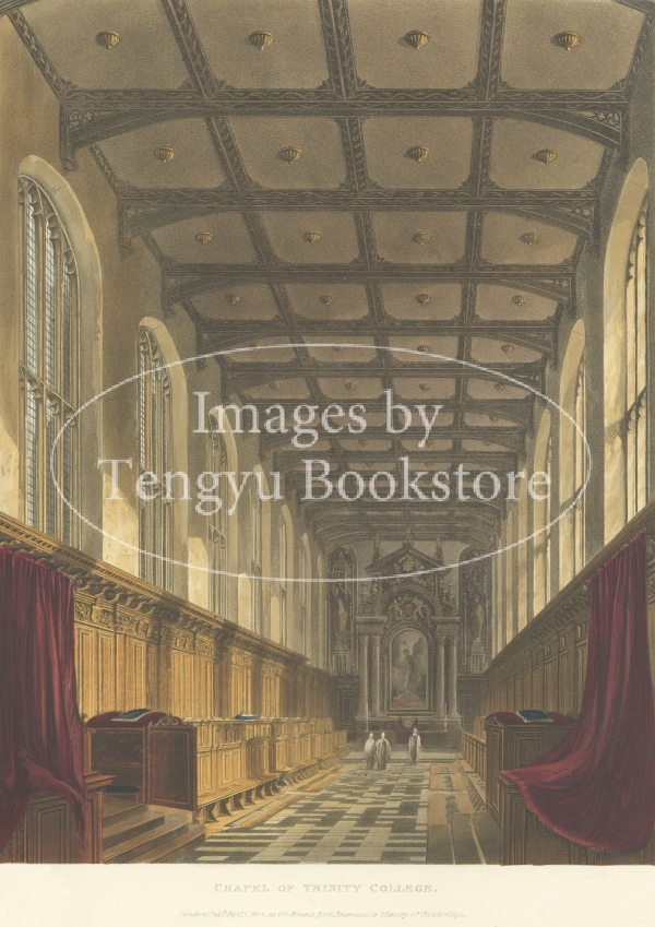 美麗な挿絵本を数多く出版したルドルフ・アッカーマン社が手掛けた本書は、歴史ある大学の建築を様々な角度から描いた手彩色銅版画を約70点枚収録したもの。