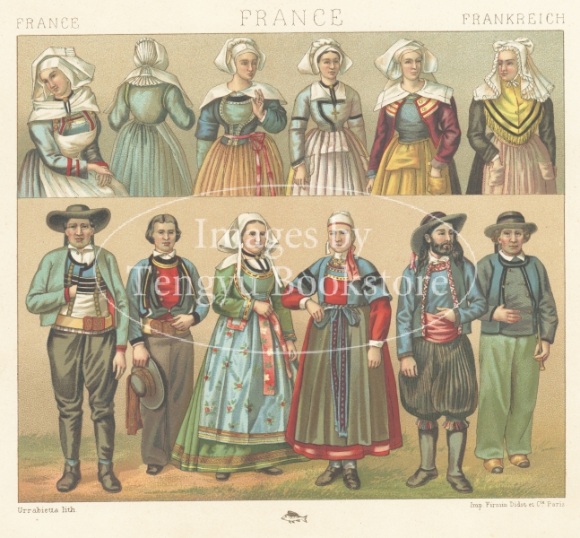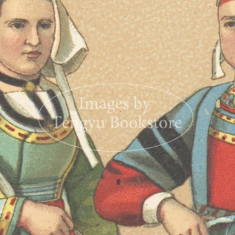 多色刷石版によってカラー印刷された、世界の歴史的衣装や民族衣装の図は、資料的な価値はもちろん、美術的にも評価の高い貴重なイラストです。